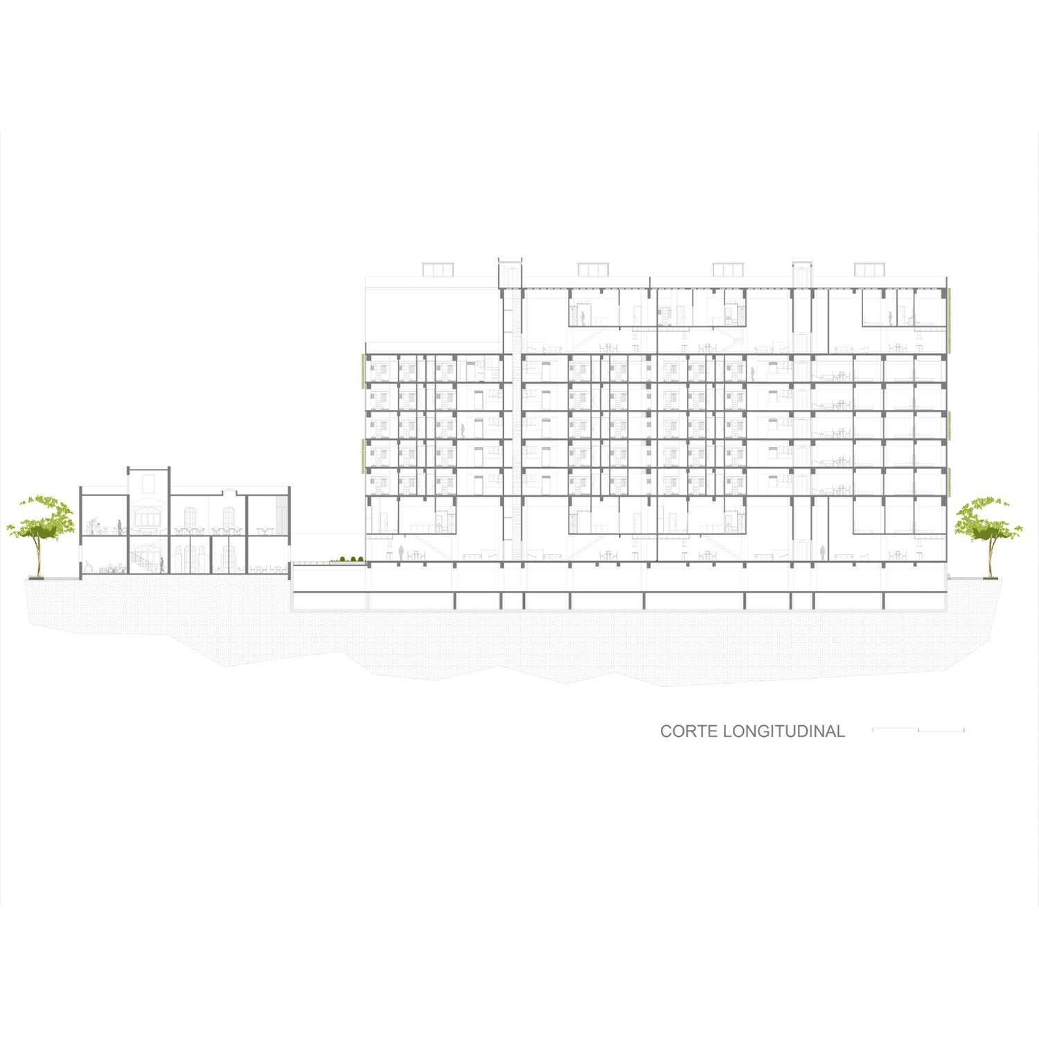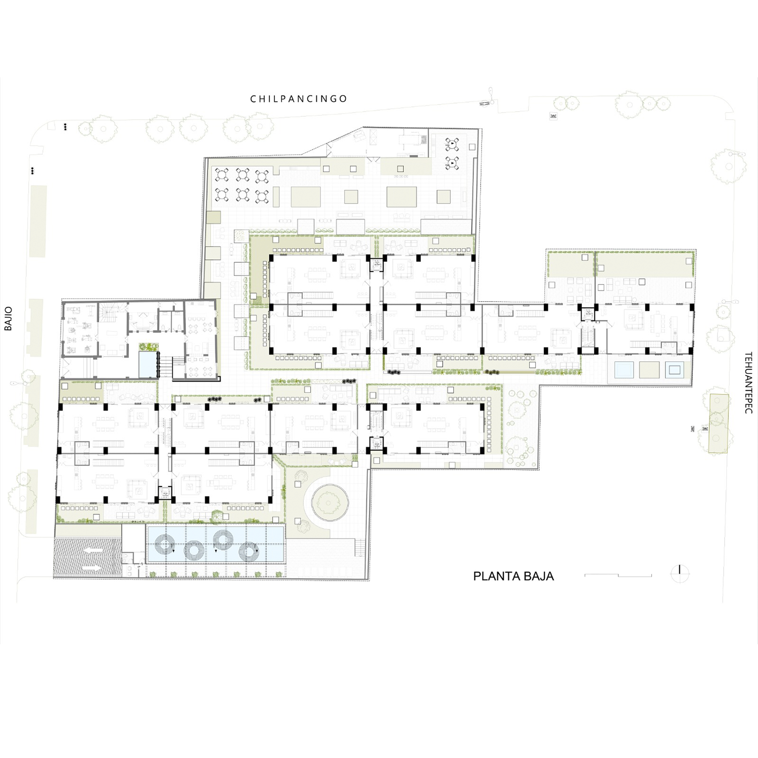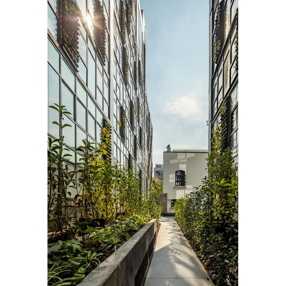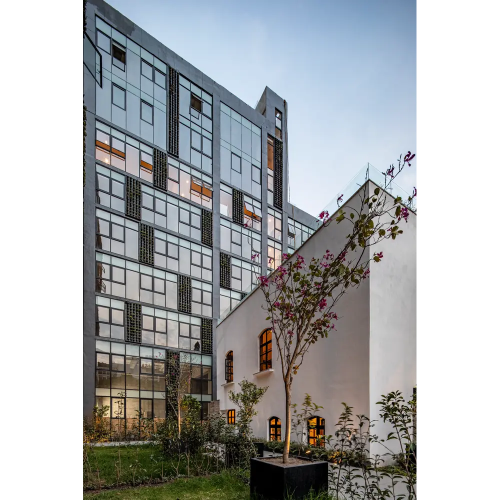 Ubicado en la colonia Roma, Ciudad de México, donde se logró conservar en su totalidad una casa con valor patrimonio cultural urbano. Resultado de la fusión de diferentes predios, con frente a 3 calles se produce un terreno de geometría irregular, ante esta problemática, el proyecto fue resuelto a partir de un eje compositivo en el sentido longitudinal, produciendo dos volúmenes ortogonales, sensiblemente de 7 niveles para dar cabida a 82 departamentos, un nivel de estacionamiento y una casa-club. El conjunto destaca al conservar el 60% de área libre, en contraste con el lote tipo de la zona, lo que permitió conservar arboles existentes y áreas permeables.
