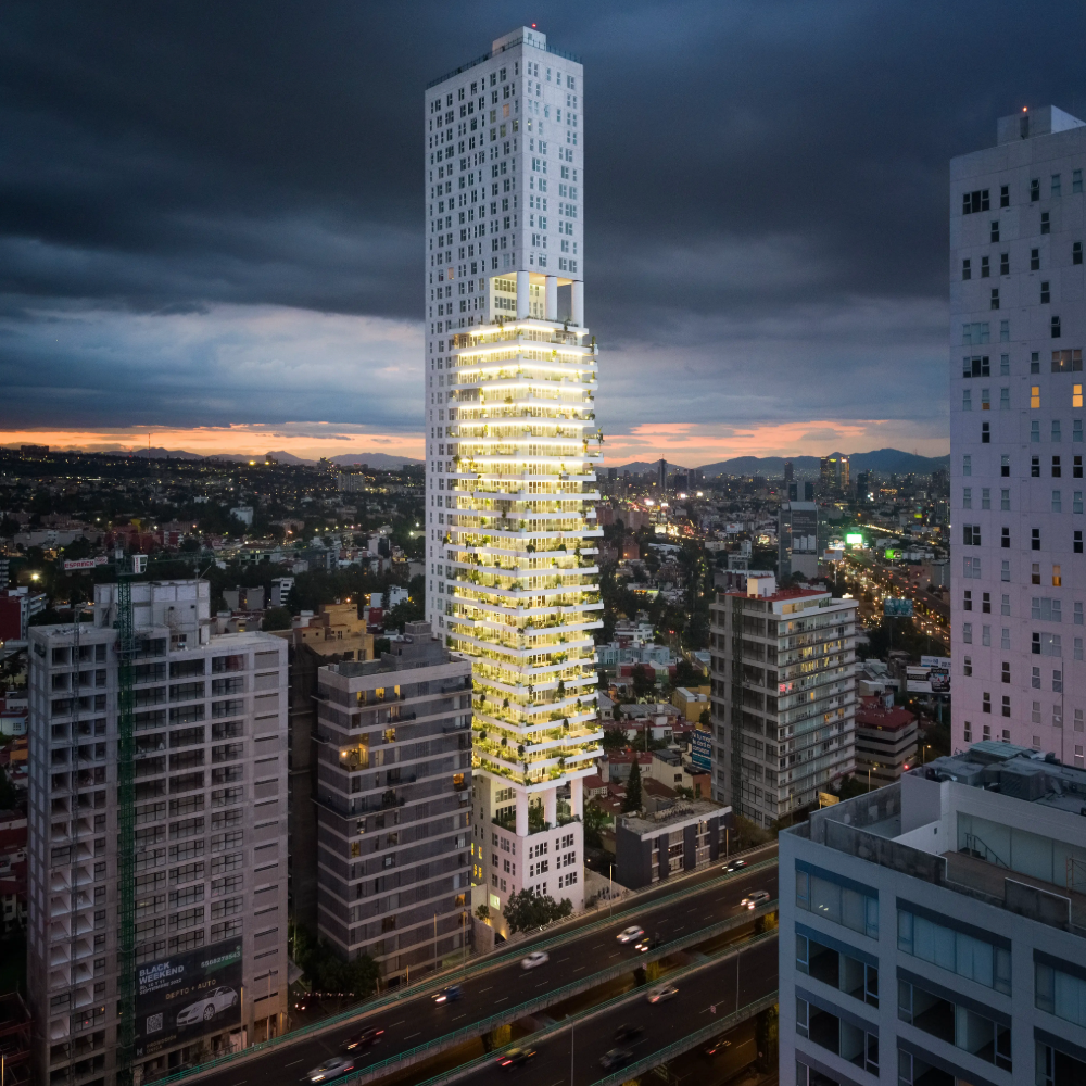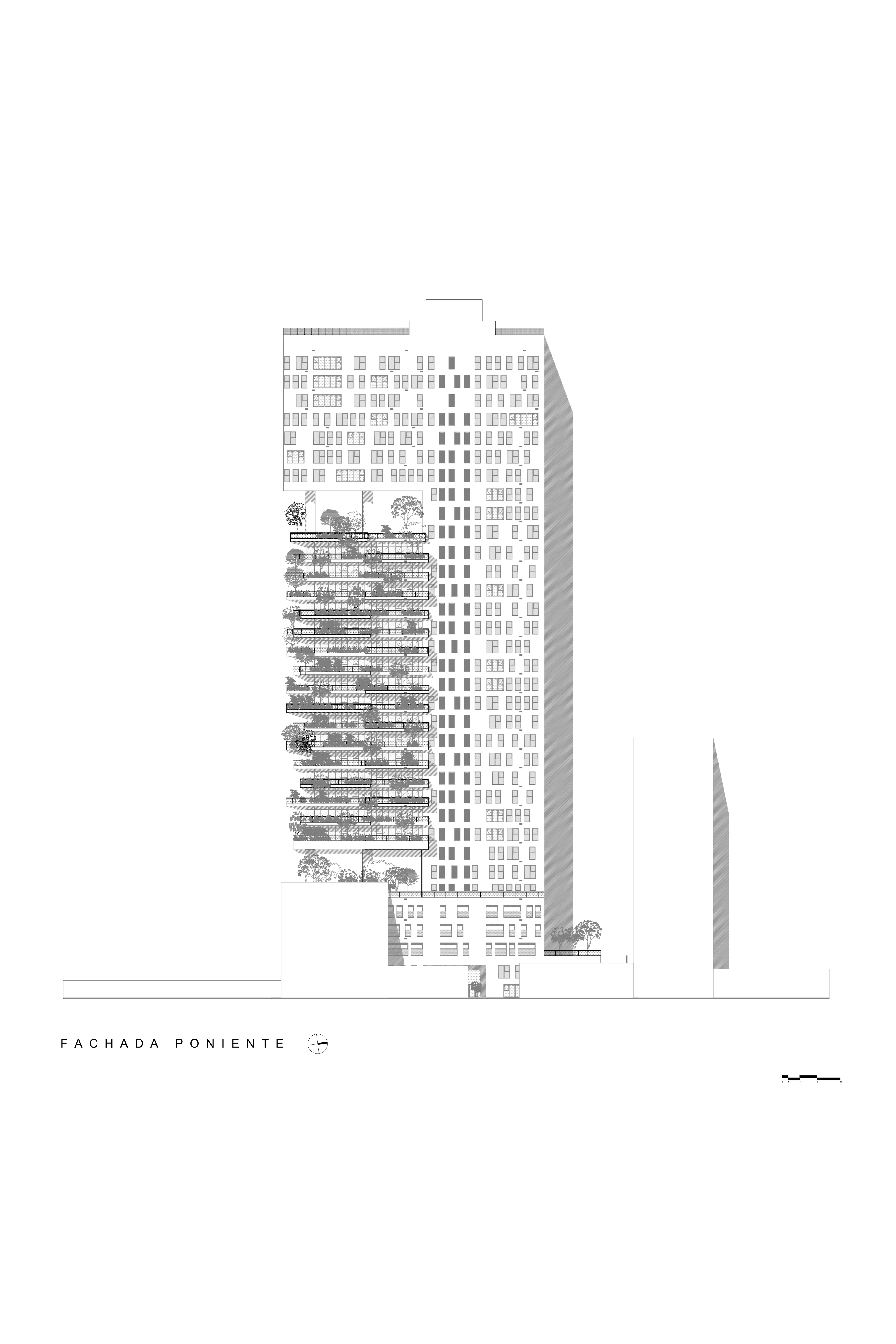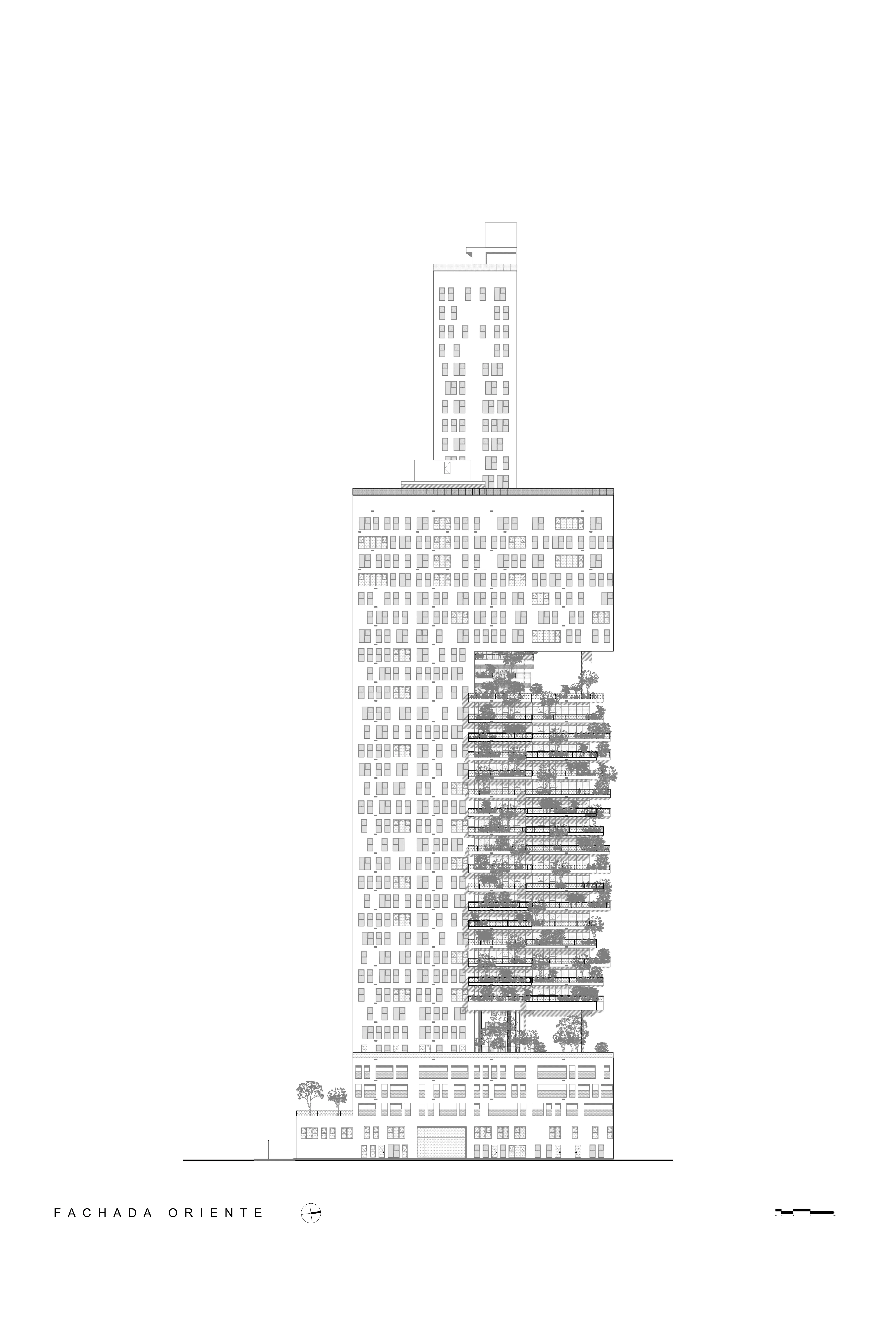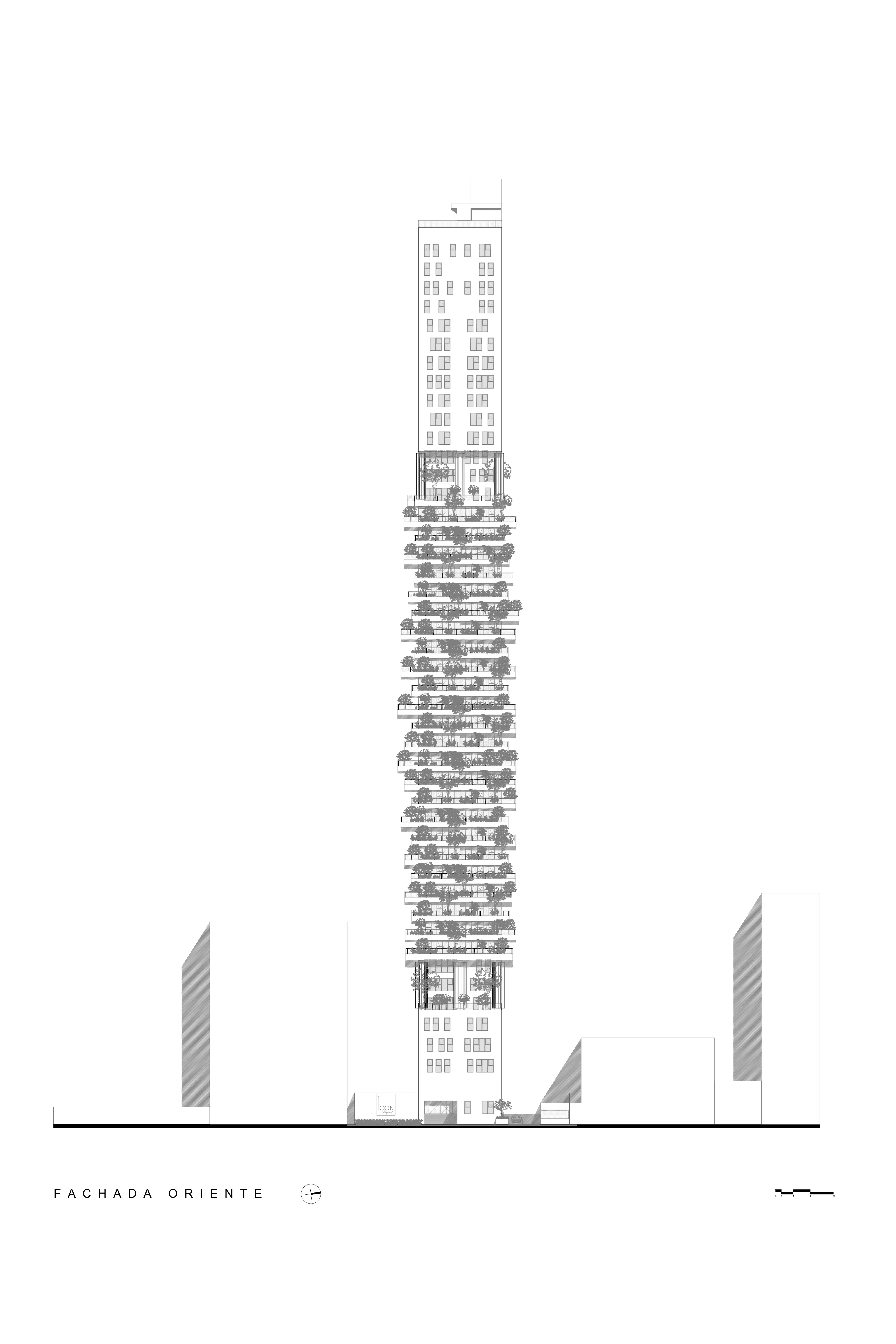 Volumétricamente el edificio fue resuelto por un prisma rectangular de 157.50 m de altura, al cual se le realizan una serie de sustracciones, generando 2 vacíos, donde se da cabida a terrazas con triple altura, que a su vez separan del cuerpo principal una serie de terrazas, diseñadas estratégicamente para alojar cerca de 220 árboles en todo el proyecto.