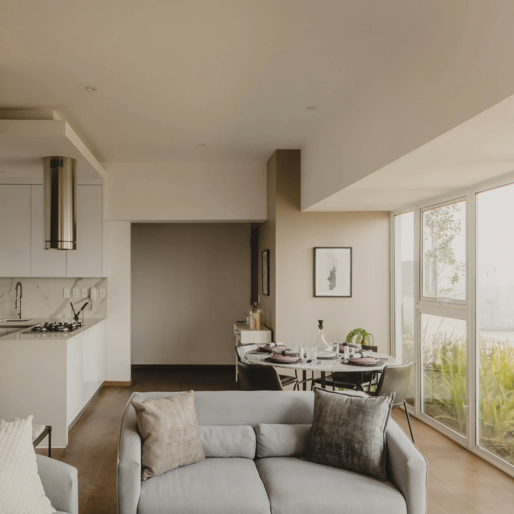 El conjunto contempla 190 departamentos con superficies de 75 a 120 m2. En planta baja se localiza el vestíbulo de acceso y amenidades, que incluyen gimnasio, alberca, spa, ludoteca y cine, así como un local comercial, en lo más alto de la torre se encuentra un rooftop, todos estos para beneficio y uso exclusivo de todos sus habitantes.