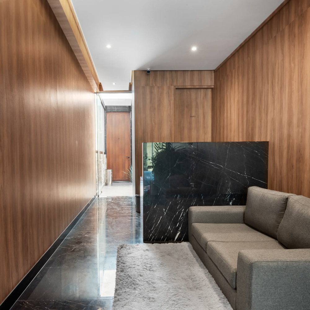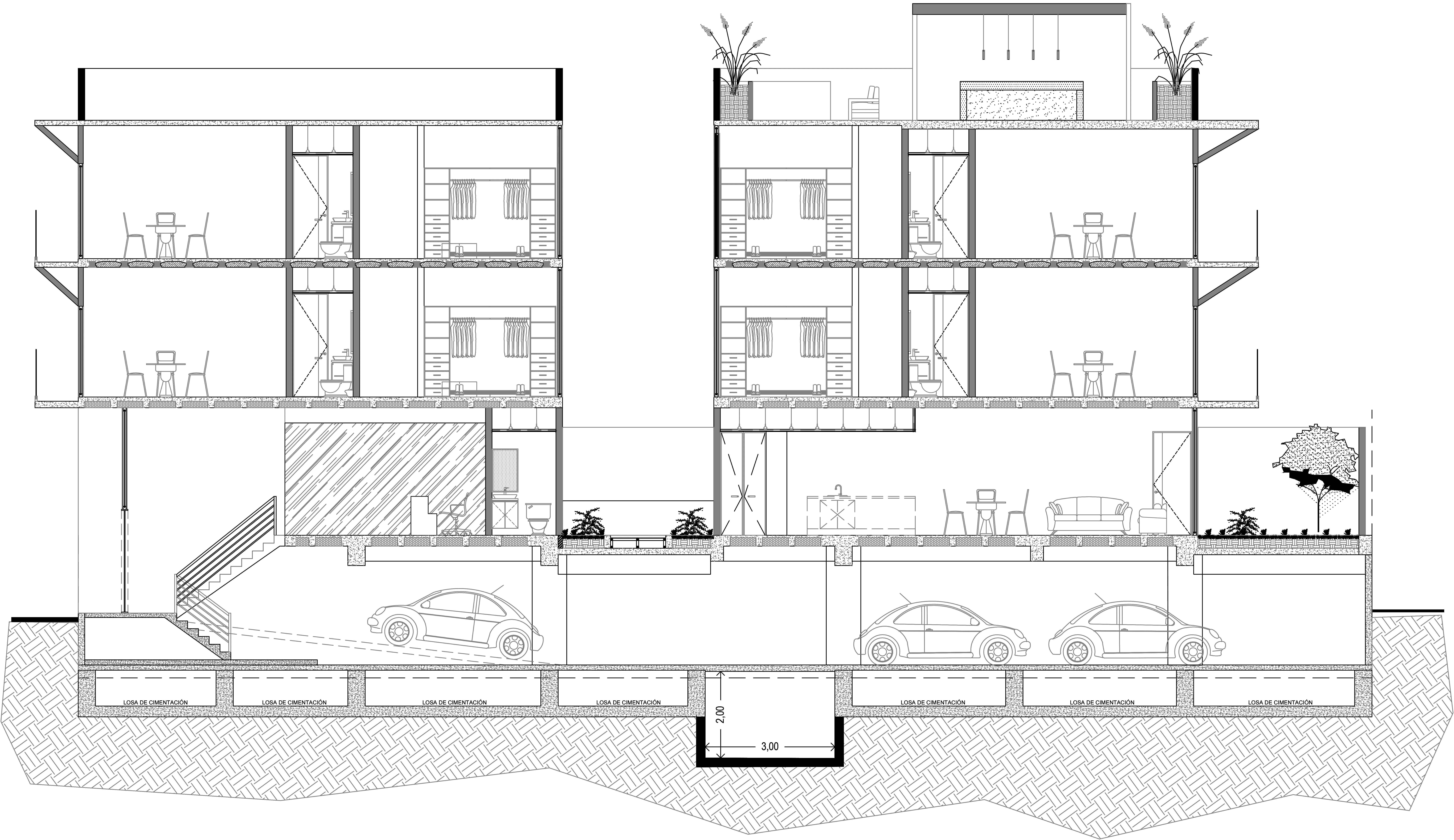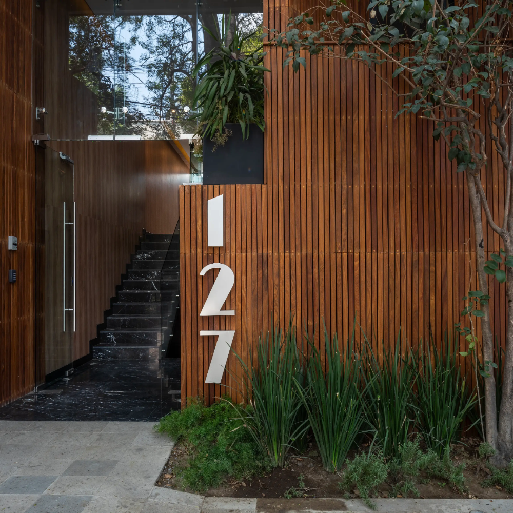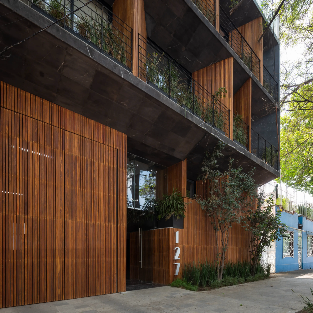 Ubicado en un pequeño espacio en la Colonia Roma, se desarrolla un edificio de Semi sótano, Planta baja y tres niveles con 11 departamentos. La planta baja se encuentra 1.80 m sobre nivel de banqueta, para proporcionar privacidad a los habitantes.